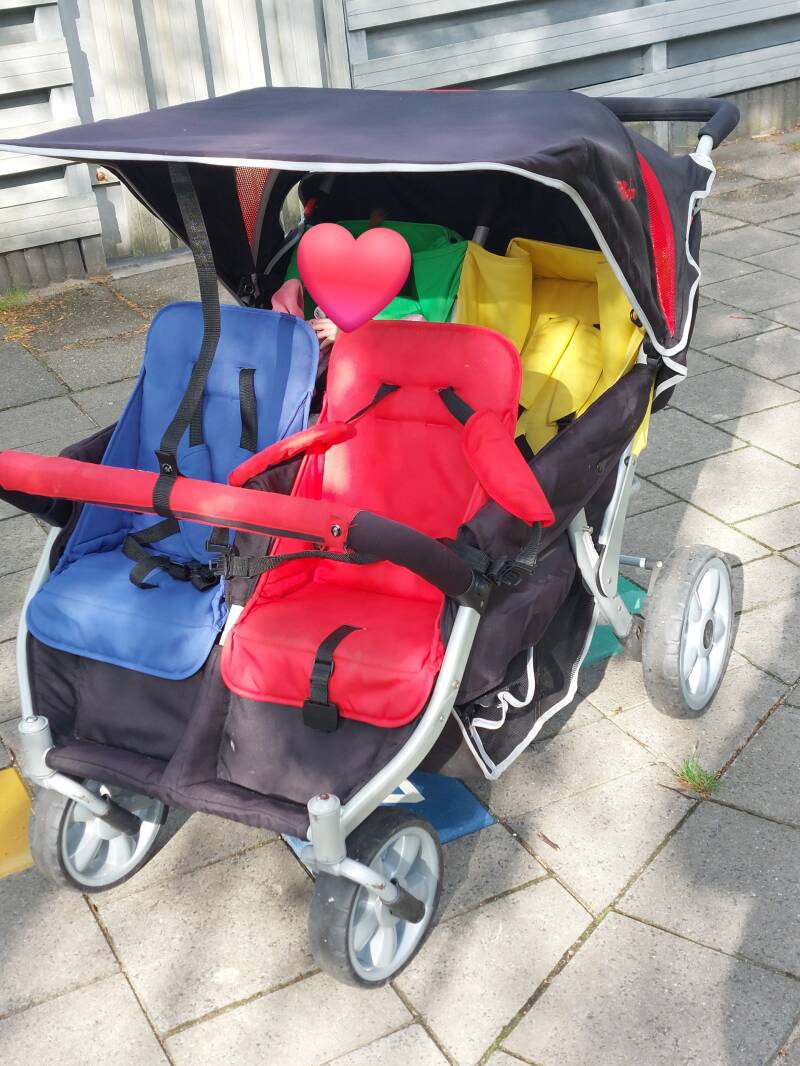 Er is een meerlingwagen, waar alle kinderen tegelijk op een veilige manier mee kunnen gaan op stap.